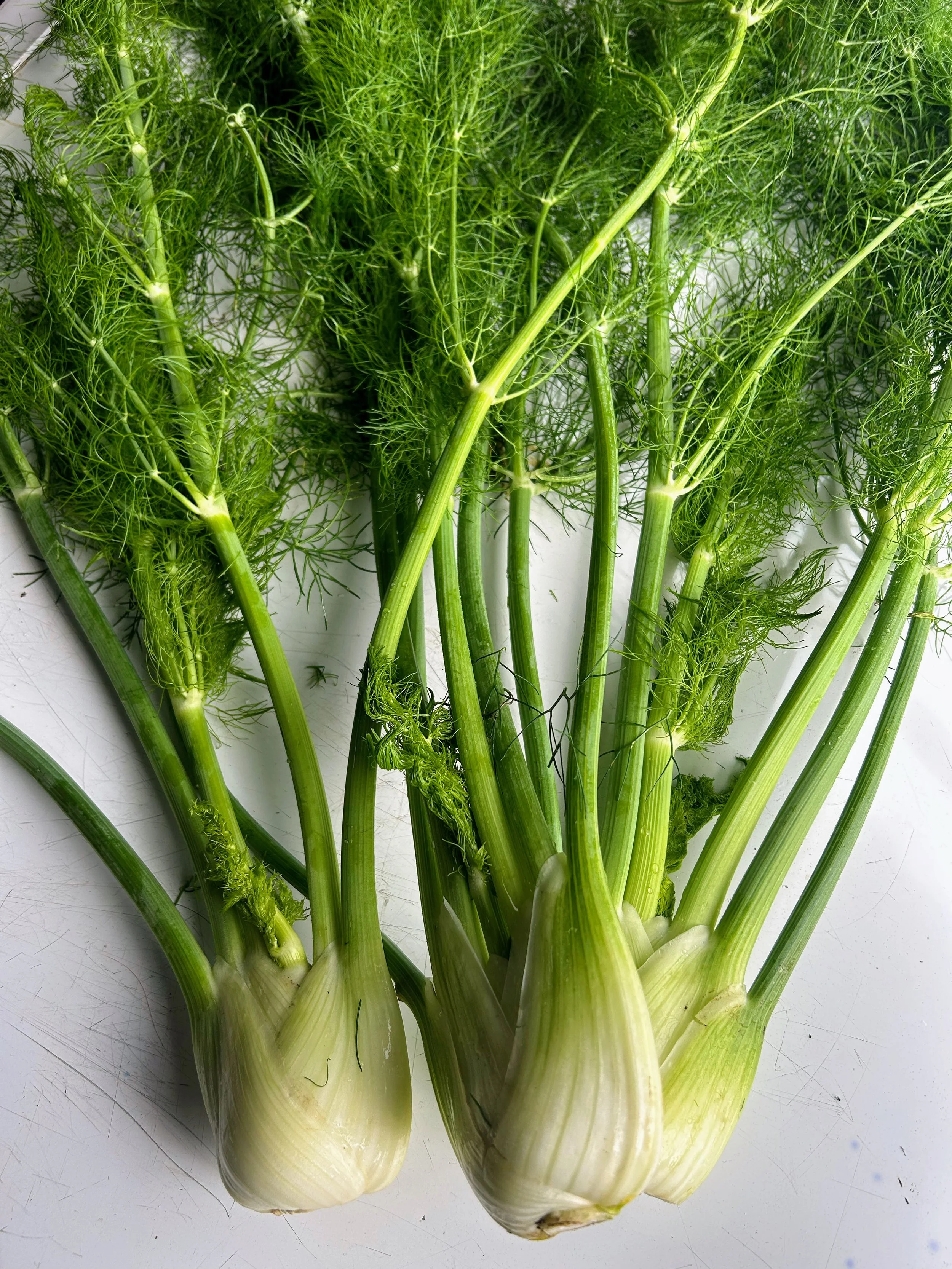 Fennel is a perennial herb in the carrot family, related to dill and parsley. The plant grows upright with feathery green fronds and a bulbous white base. Fennel bulbs develop at the base of the plant, drawing water and minerals from the soil, which help give them their crisp texture and naturally sweet, aromatic flavor. Both the bulb and fronds are edible, and the seeds can be used as a spice.