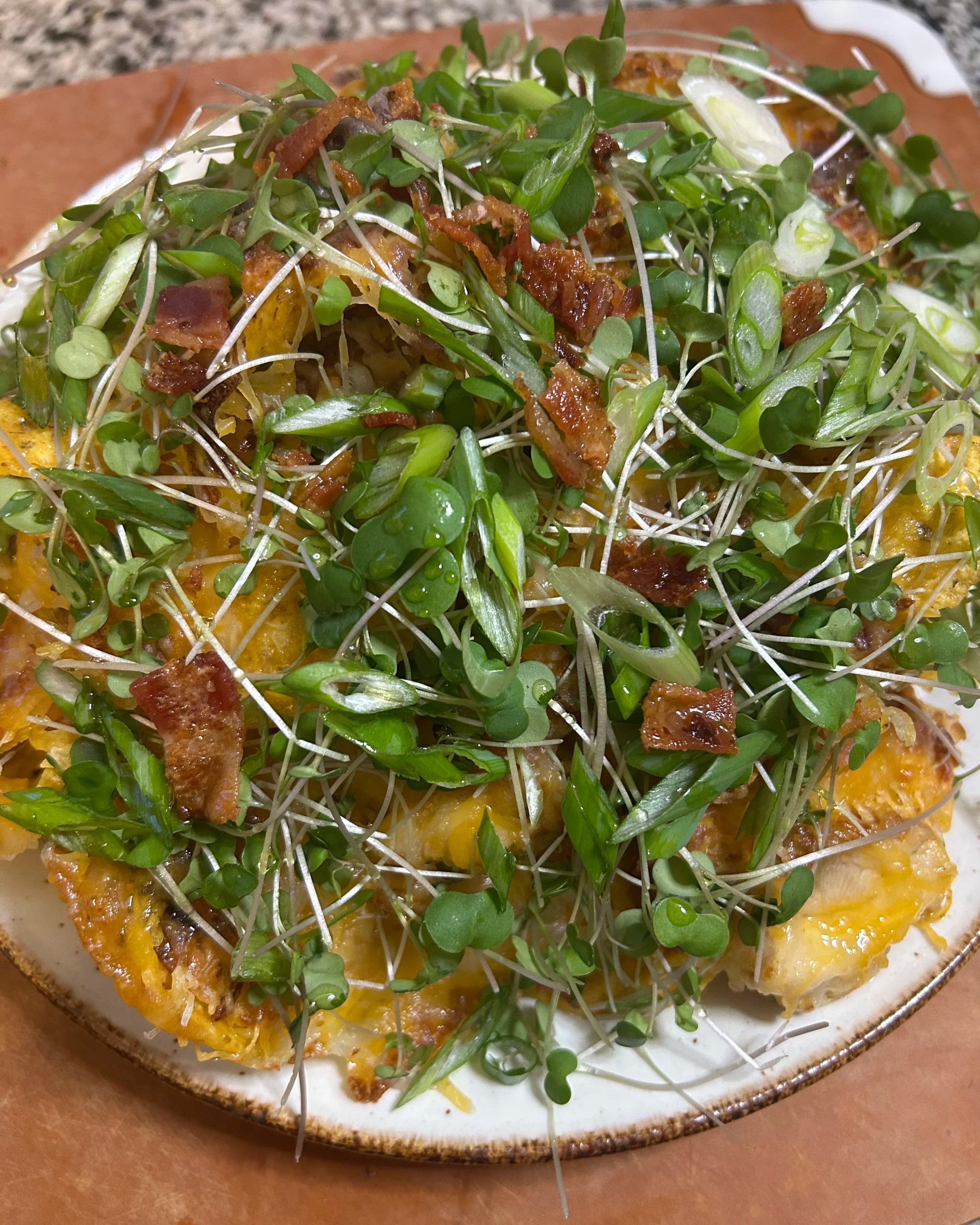 Ready to indulge in something insanely delicious? These nachos have it all: salty chips, melty cheese, smoky bacon, and a generous drizzle of creamy homemade ranch, all balanced with a fresh topping of Area 2 Farms’ microgreens.